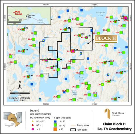 Figure 4 Block H showing the anomalous Be and Th lake sediment samples