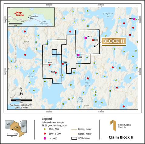 First Class Metals PLC (‘First Class Metals’, ‘FCM’ or the ‘Company’) the UK listed company focused on the discovery of economic metal deposits across its exploration properties in Ontario, Canada, is pleased to announce the successful completion of an option to purchase two properties with highly anomalous Rare Earth Elements (‘REE’) samples.