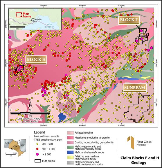 - The two optioned properties, Block H (~18km²) and Block F (~33km²), are located within one of the most anomalous REE regions identified in the Ontario province-wide lake sediment geochemical database.